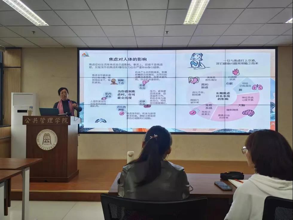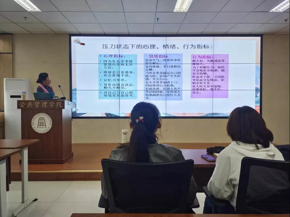 郑安云教授从研究生心理问题现状、如何理解压力、压力与心理健康的关系、研究生心理压力分析和压力管理与心理调适共五个方面,生动有趣地与同学们分享了有关研究生压力及其管理与心理调适的案例和知识。