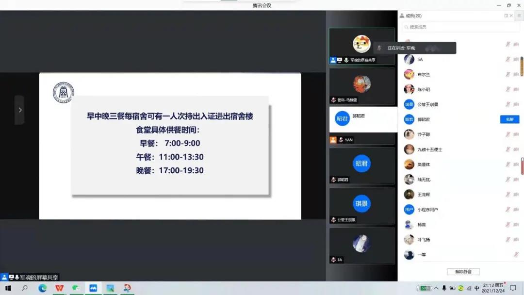 为深入贯彻落实我校疫情防控工作会议精神,做好大一年级防疫抗疫工作,保障学生生命安全与身心健康。12月27日晚21:00,我院召开2021级本科生线上疫情防控政策传达会。2021级本科生辅导员杨琬钰主持会议,2021级全体学生干部参会。