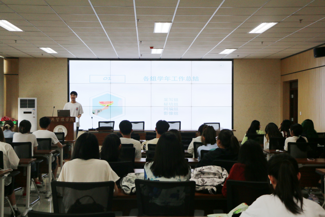 会议伊始,全媒体各组负责人进行工作总结。采写组、秘培组、网编组和影像组的负责人依次上台发言。他们分别总结了过去学年的工作成果,同时也提出了组内未来的规划,也对在座的各位组员予以肯定和鼓励。
