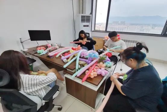 合作分工条理晰,埋头苦做胸竹现。在活动准备阶段,同学们根据策划书的具体拟定细则,分工合作明确,利用业余时间,发挥自身特长,以颜色各异的气球和扭扭棒为主要材料,做出各式各样的手工艺品,主要有发箍、花束、小动物三类,如“御剑飞行”、章鱼、螃蟹等等。