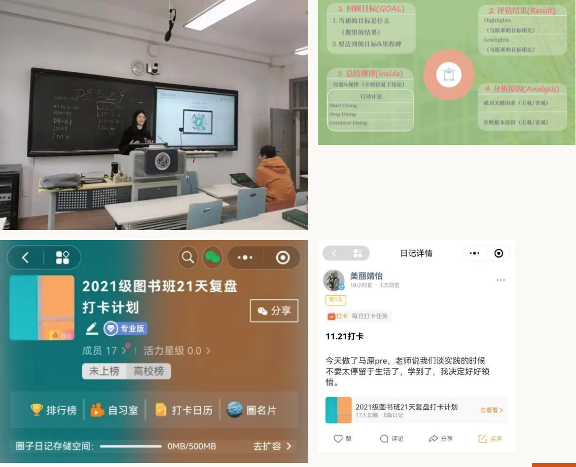 随后,针对最近班级的出勤问题,班长王萱瑜向同学们提出新要求,建立班级内部考勤制度。同时,为更好进行学风建设,班级建立了“2021级图书班21天复盘打卡计划”打卡项目。依托本专业知识管理相关知识,构建每日复盘模板,提供平台帮助同学们对自己每日每周的学习与工作进行梳理、对自己的优点与缺点进行深度剖析,使其能够更清楚地了解自身能力、把握自身发展方向、为自身发展赋能。