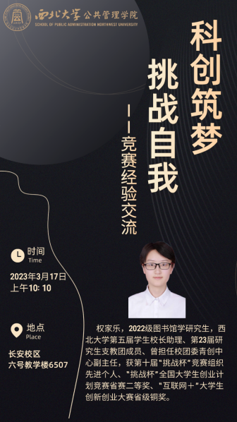 为进一步涵养优良学风,营造浓厚学术氛围,增强学生自主创新创造意识,激发学生参与科创竞赛的热情与信心,2023年3月17日至4月7日期间,西北大学565net必赢各年级召开“科创筑梦,挑战自我”竞赛经验分享交流会,此次系列分享由2022级图书馆学研究生权家乐主讲,以竞赛开展全流程为主要脉络,详细说明参赛要点,鼓励同学们积极参与学术科技竞赛,以坚持不懈的努力和踏实严谨的态度不断乘风破浪、开拓创新。