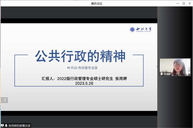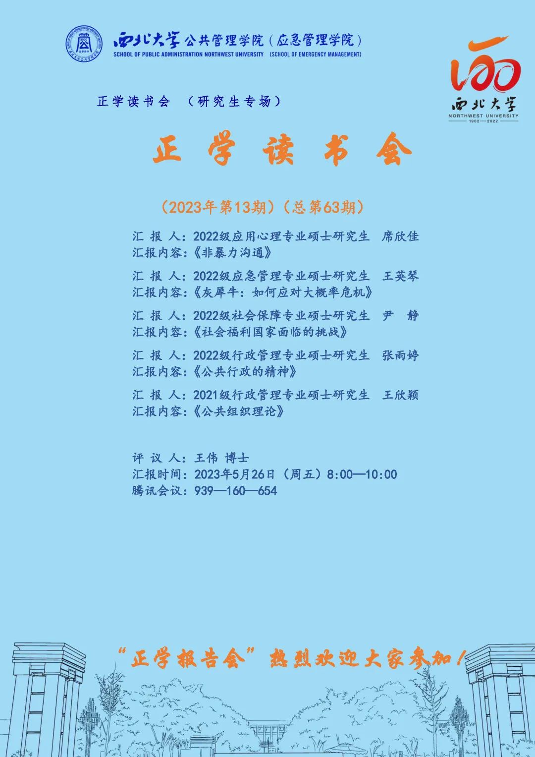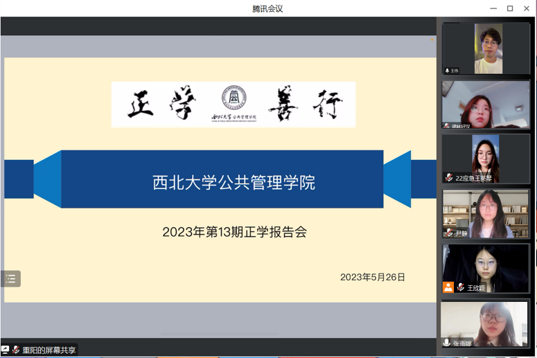 2023年5月26日下午,我院线上举办了2023年第13期正学读书会。2022级应用心理专业硕士研究生席欣佳、2022级应急管理专业硕士研究生王英琴、2022级社会保障专业硕士研究生尹静、2022级行政管理专业硕士研究生张雨婷、2021级行政管理专业硕士研究生王欣颖分别作为主讲人进行读书汇报,565net必赢2022级博士研究生王伟担任评议人,部分研究生旁听了此次报告会。