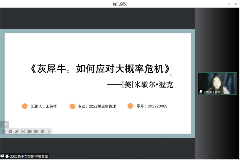 2022级应急管理专业硕士研究生王英琴分享的书目为米歇尔·渥克的《灰犀牛:如何应对大概率危机》,她从作者简介、核心观点和现实启发三个方面进行了详细讲述。首先,王英琴同学对本书作者进行了简要的介绍。接着,她从什么是灰犀牛事件、预测灰犀牛事件的阻碍、灰犀牛事件的五个阶段详细介绍了本书和核心内容,她指出灰犀牛事件是指高概率、影响大的事件,在预测过程中会受到集体思维等人类自身认知倾向以及利益驱使的主观任性的影响,因此人们在面对灰犀牛事件时往往会经历否认、拖延、判断、恐慌四个阶段,最后才会进入到行动阶段。最后,基于前面对灰犀牛事件的性质和阻碍的分析,她介绍了本书对我们应对灰犀牛事件的启示。