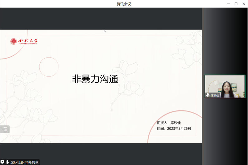 2022级应用心理学专业硕士研究生席欣佳分享的书目为马歇尔·卢森堡的《非暴力沟通》。她的主要分享内容围绕书中内容展开,包括如何区分暴力与非暴力、非暴力沟通的四个要素以及应用。首先她通过引入暴力之树的概念,指出隐蔽的暴力虽然危险系数不高,但出现的次数高,同样对个体的身心健康有害,引出使用非暴力沟通的必要性。其次,她详细描述了非暴力沟通的四个要素:观察、感受、需要和请求,并谈了如何正确理解并应用。最后,她指出在进行非暴力沟通时的一些注意事项,避免错误使用给自己带来困扰。