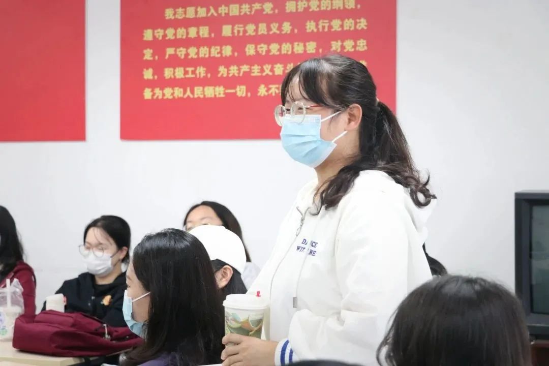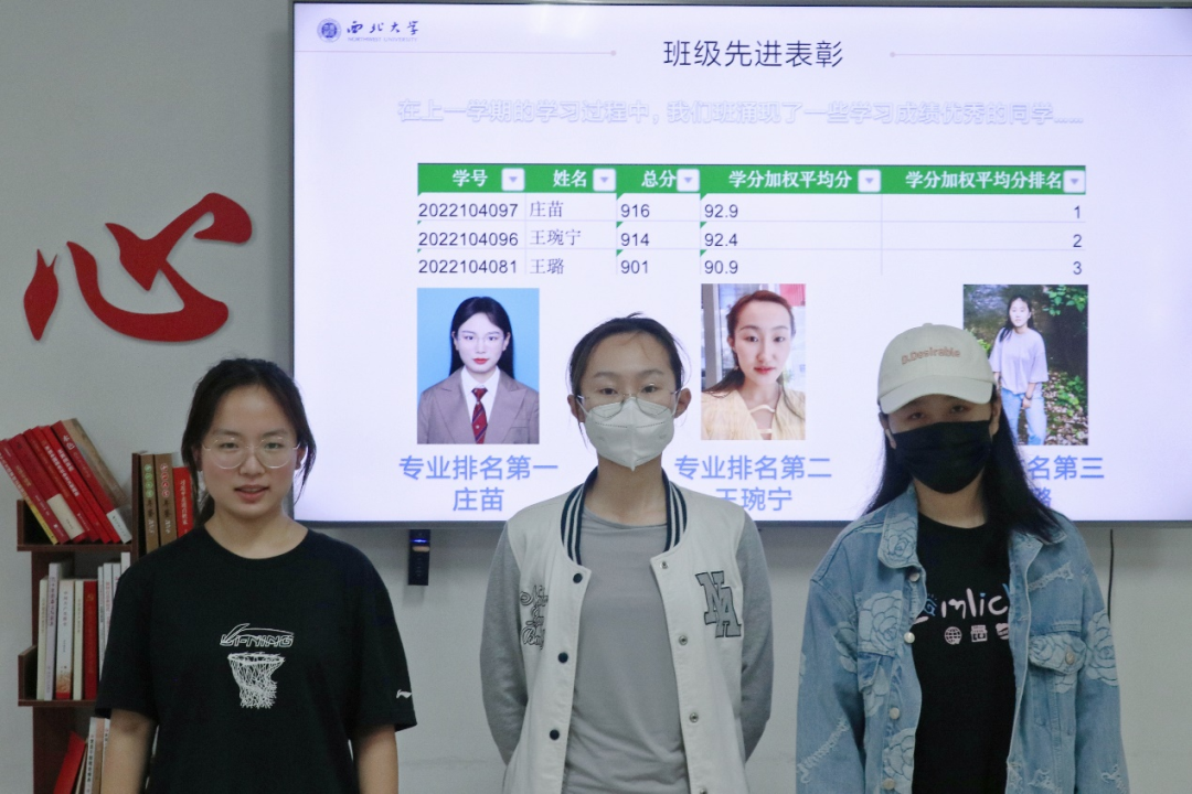 接下来,进行班级先进表彰环节,对在上一学期分别取得专业第一、第二、第三名的庄苗、王琬宁、王璐三位同学进行表彰,鼓励班级其他同学向身边优秀榜样学习,积极交流学习经验。而后,专业排名第一的庄苗同学向大家分享了学习感悟。