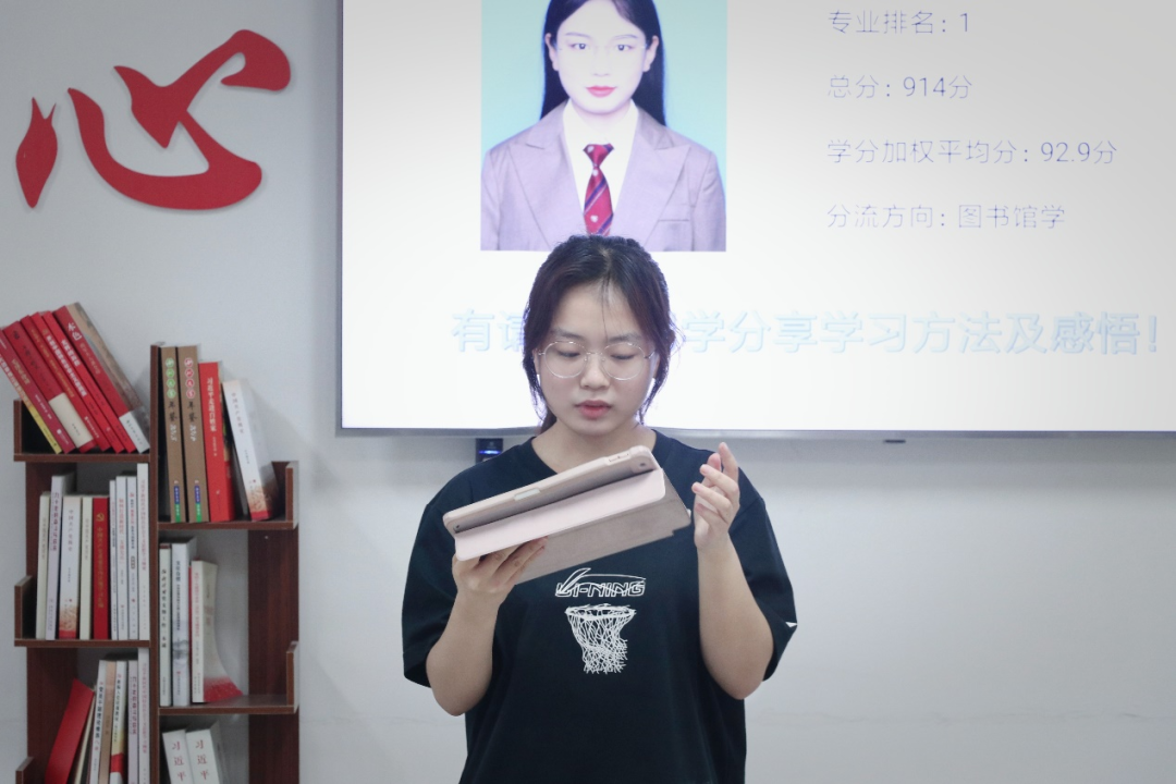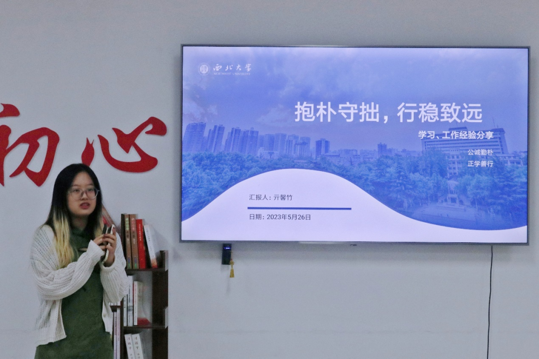随后,2021级图书馆学专业亓馨竹以“抱朴受拙,行稳致远”为主题进行学习、工作经验分享。亓馨竹学姐就个人学业情况、党团学工工作经历、科创竞赛参与概况、志愿服务参与情况进行了详细介绍,详细解答了同学们的疑惑,为同学们之后的学习生活提供了借鉴。