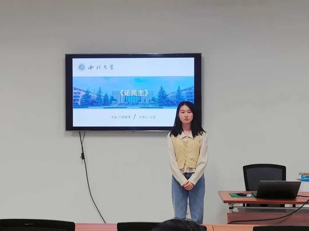 2022级行政管理专业硕士研究生王淳分享的书籍为《论民主》,她从书籍及作者简介、写作背景与主题、框架与核心内容、个人感悟四个方面展开分享。在框架与核心内容部分,她首先对民主的起源及达尔对“民主起源”的看法进行了回顾。然后介绍了理想的民主必须满足的五个标准、实行民主的十个原因、需要政治平等的五个原因、现实中大型民主需要的六项制度安排、以规模为依据划分出的两种民主类型。最后探讨了书中关于有利于民主发展的五个条件和未来民主发展可能遇到的四个挑战。