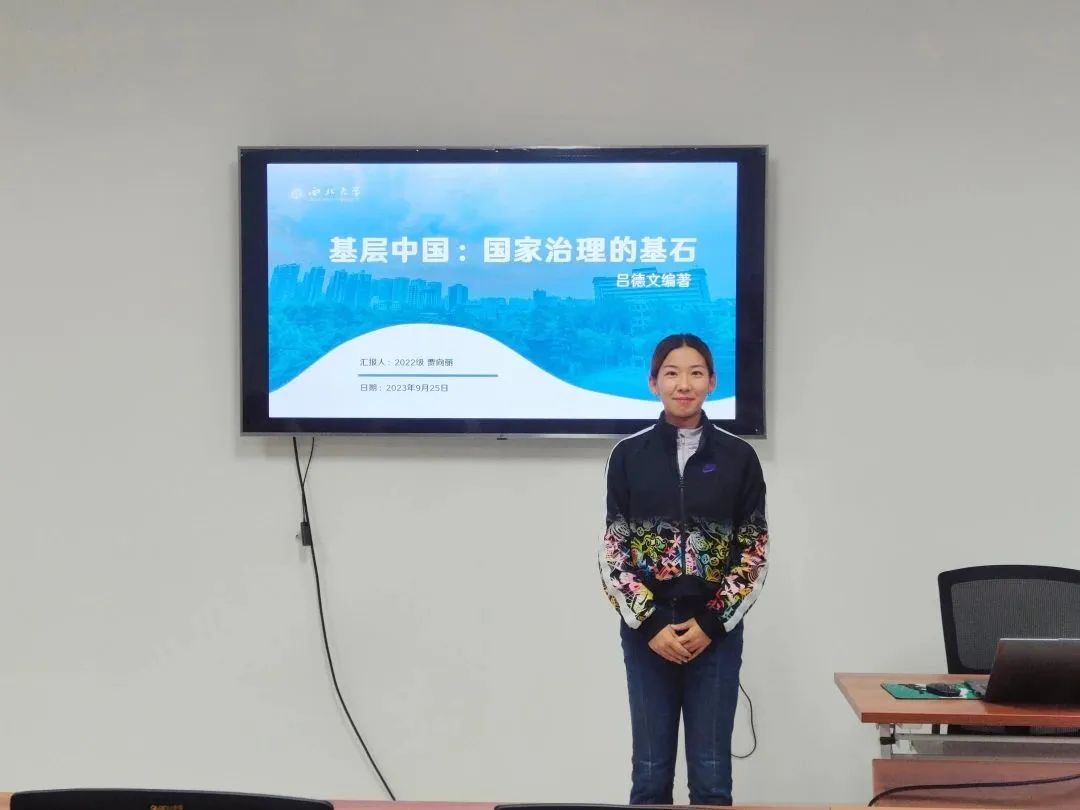 2022级行政管理专业硕士研究生贾向丽分享的书目是吕德文所著的《基层中国:国家治理的基石》,她从作者简介、主要内容、书籍观点的研究思考、启示借鉴四个方面进行分享。首先,她基于中国社会正在经历百年未有之大变局、大兴调查研究之风、基层治理的重要性与复杂性的背景,以及作者的观察对治理现代化等基层热点难点问题进行梳理,既涉及乡村振兴、城乡融合发展、治理现代化等宏观问题,又关注乡村经济、社会、文化、政治生活变迁等微观现象,将作者期望描述的一个相对全面的基层中国社会的面貌呈现在大家面前,并尝试作出基于经验立场的解释。其次,她对作者的写作模式加以探究,并对具体的基层治理现象溯源,揭示我国基层治理的逻辑本质。