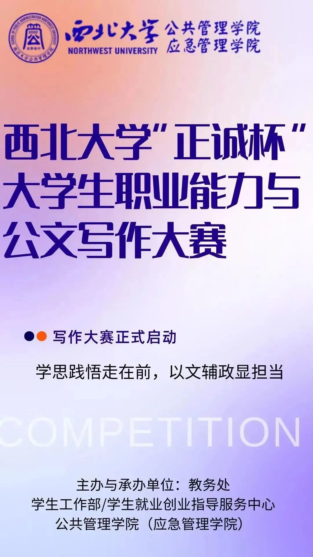 为提升我校学生言语理解与表达、逻辑推理、资料分析、问题分析与解决、公文写作等行政职业能力,提高人才培养质量,特举行西北大学2023年“正诚杯”大学生行政职业能力与公文写作大赛。