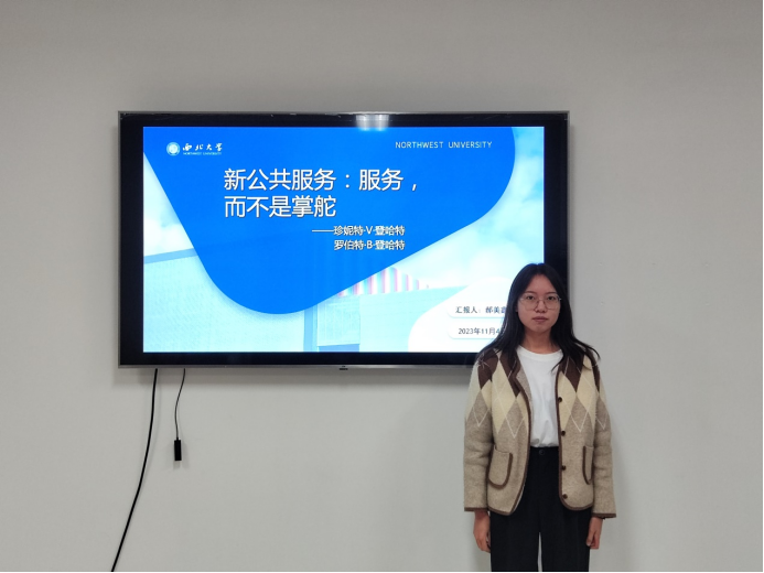 2022级行政管理专业硕士研究生郝美鑫分享的书目为珍妮特·V·登哈特和罗伯特·B·登哈特的《新公共服务:服务,而不是掌舵》,她的汇报主要包括新公共服务的理论来源、理论内涵、新公共服务理论的意义与价值、新公共服务理论的局限和思考与启示五个方面。她首先简要介绍了这本书,指出本书提出的以人为本的价值取向、公共利益至上的服务理念、为民执政的服务宗旨和民主参与的服务方式,对致力于行政体制改革、构建和谐社会的当今中国具有积极的指导意义。接着,她对本书的核心观点进行了阐释,分析了新公共服务理论的价值与局限。最后,她向同学们分享了自己的思考与启示,提出了本书对现阶段中国公共管理的意义。