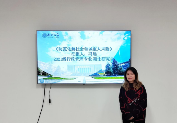 2021级的硕士研究生冯晨同学分享了李雪峰的《防范化解社会领域重大风险》,她从作者简介,著作背景,核心思想,作者观点四个部分对该书进行了解读。她首先基于国内和国际背景对为什么要关注重大风险问题进行了阐述。当前,在科技创新动力不足,东西部发展失衡等客观发展背景下,防范化解社会领域重大风险是中国应对新发展阶段的风险之策。其次,在全面建设社会主义现代化强国征程中,我国社会面临的不确定性和不稳定性因素增加。意识形态领域的战争无处不在,因此关注重大风险也是全面建设社会主义现代化强国的目标。解读完本书的著作背景后,她从政治领域,社会领域,文化领域三个层面的风险治理来梳理本书核心观点,强调具有忧患意识,做到居安思危,是我们治党治国必须始终坚持的一个重大原则。