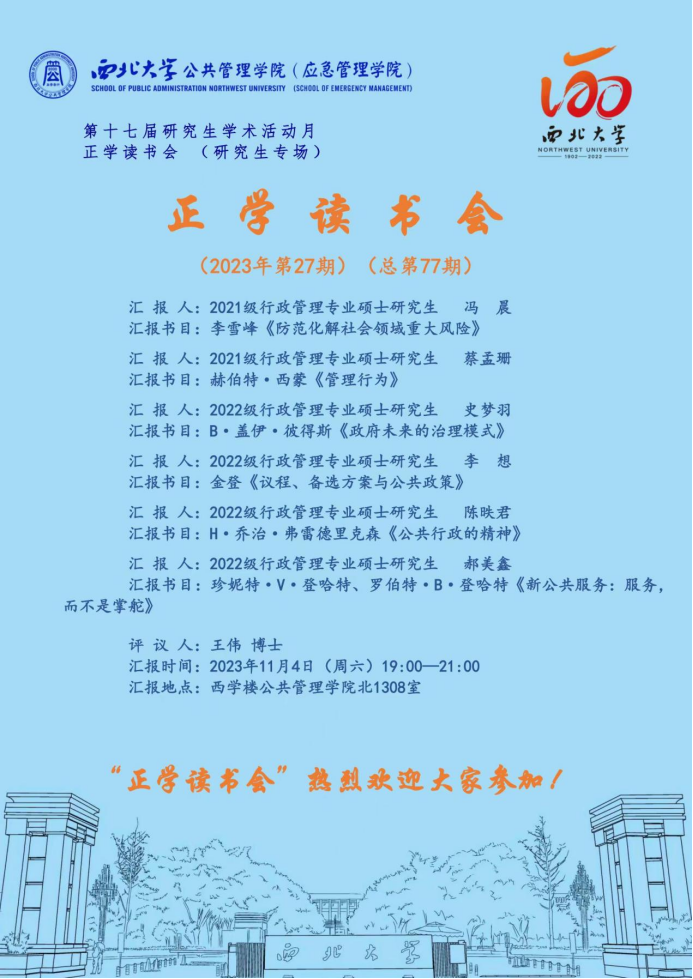 2023年11月4日晚上,我院在西学楼北1308室举办了2023年第27期正学读书会。2021级行政管理专业硕士研究生冯晨、2021级行政管理专业硕士研究生蔡孟珊、2022级行政管理专业硕士研究生史梦羽、2022级行政管理专业硕士研究生李想、2022级行政管理专业硕士研究生陈昳君、2022级行政管理专业硕士研究生郝美鑫分别作为主讲人进行了读书汇报,565net必赢2022级博士研究生王伟担任评议人,部分研究生旁听了此次报告会。