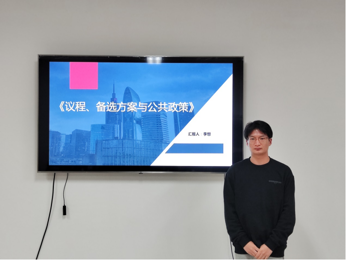 2022级行政管理专业硕士研究生李想分享的书目是美国政策科学家金登教授的代表作《议程、备选方案与公共政策》,他从书籍简介、主要内容及个人感受三个方面进行汇报。在书籍简介方面,李想同学介绍了公共政策过程的核心环节——议程建立和公共政策的形成过程,并梳理了全书的逻辑框架;在主要内容方面,李想同学介绍了该书中重要的多源流理论,并以多源流模型中的问题源流为例进行集中分析,结合自己的思考与理解,探讨问题源流是如何打开政策之窗;最后,李想同学分享了自己的阅读感受,就多源流模型的应用和创新与在座的同学们进行了简单的交流。