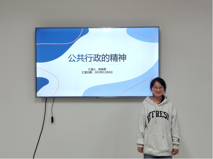 2022级行政管理专业硕士研究生陈昳君分享了由H·乔治·弗雷德里克森编写的书籍《公共行政的精神》,她从作者介绍、全书重点、公共行政价值丧失的原因以及公共行政精神的重塑四方面进行了介绍。首先,她从“公共”、“公共行政的根本目的”、“公共行政中的伦理道德”三个层面阐释了本书的核心观点。紧接着,她引出公共行政价值及其丧失的原因是“个人主义”、“效率至上”以及“政治中立”三方面。最后,她分享了公共行政价值重塑的三种途径,强调了乐善好施的爱国主义精神对公务员的重要性,并结合自身所学专业知识,提出了自己在阅读中产生的困惑和对本书的评价,浅述了自己的启示和收获。