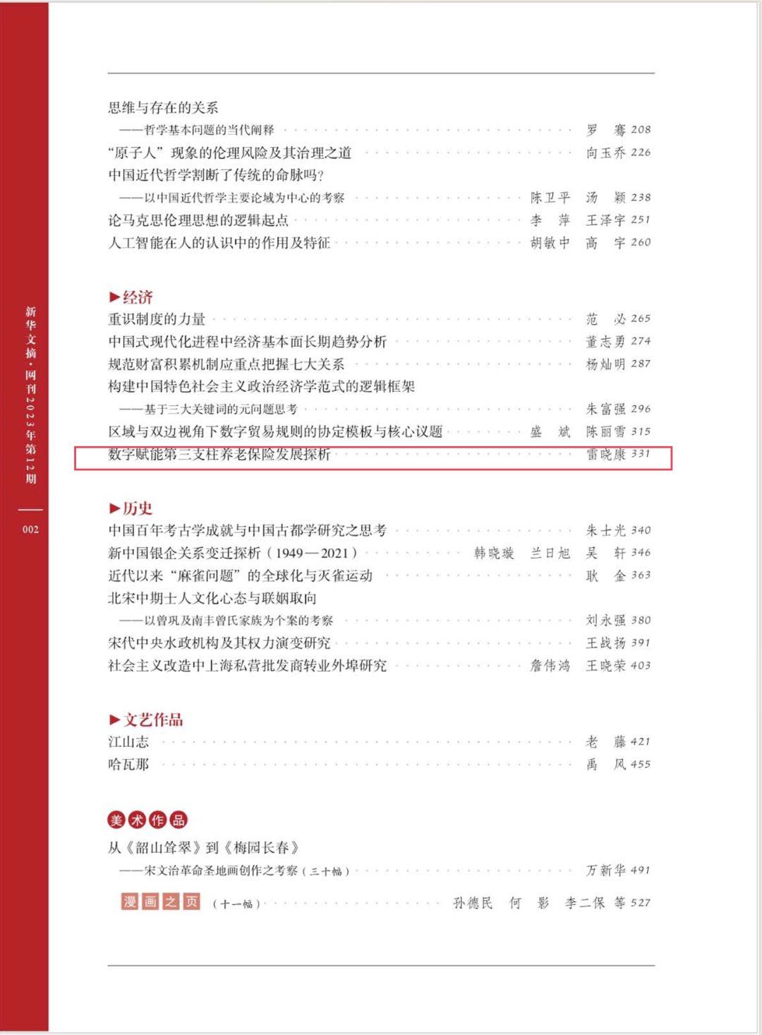 《新华文摘 》(网络版)全文转载我院雷晓康教授的论文《数字赋能第三支柱养老保险发展探析》