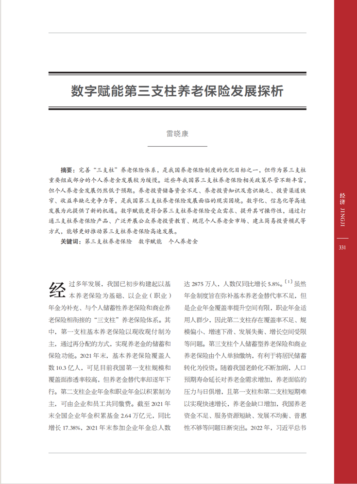 完善“三支柱”养老保险体系,是我国养老保险制度的优化目标之一,但作为第三支柱重要组成部分的个人养老金发展较为缓慢。近些年我国第三支柱养老保险相关政策尽管不断丰富,但个人养老金发展仍然低于预期。养老投资储蓄资金不足、养老投资知识及意识缺乏、投资渠道狭窄、收益率缺乏竞争力等,是我国第三支柱养老保险发展面临的现实困境。数字化、信息化等高速发展为此提供了新的机遇。数字赋能更符合第三支柱养老保险受众需求、提升其可操作性,通过打通三支柱养老保险产品、广泛开展公众养老投资教育、规范个人养老金市场、建立简易投资模式等方式,能够更好推动第三支柱养老保险高速发展。