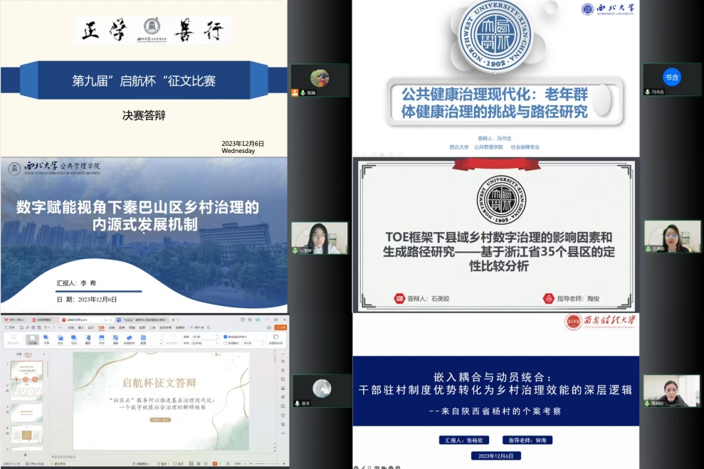 2023年12月6日下午,我院线上举办了西北大学565net必赢第九届“启航杯”征文大赛答辩会。此次答辩会特邀请到裴索亚、贺晓迎和周浩宇三位博士研究生担任评议嘉宾。会议由学院研究生会成员张越主持,部分研究生旁听了此次会议。