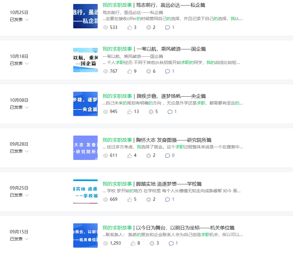 学院开辟“我的求职故事”专栏,累计发布12篇推送,对顺利求知于机关单位、研究院所、学校、央企、国企、私企的优秀学子进行了专题报道,对个人求职经历、求职经验、心路历程进行深度采访,为在校学生提供求职道路上的指导,引导学生们提前做好职业生涯规划和相应准备。