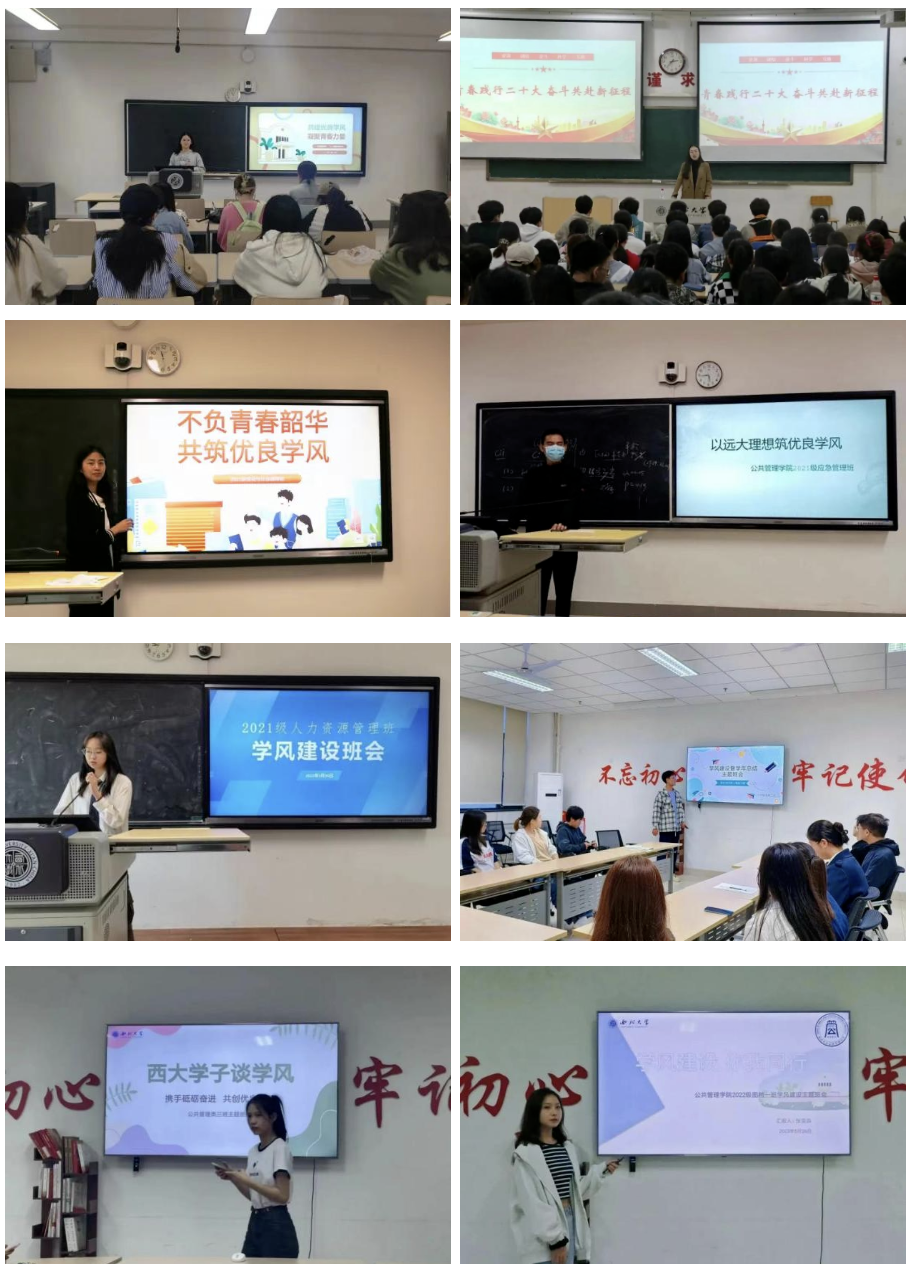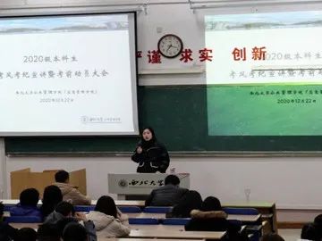 学院通过召开年级大会、主题班会、班委例会,进一步强调课堂和晚自习纪律以及具体学风建设目标,引导学生自发遵守课堂纪律以及养成良好课堂行为规范,制定学期学习目标任务,提高学风建设内在主动力。学院各年级召开考风考纪教育主题宣讲暨考前动员大会,通过学习《国家教育考试违规处理办法》《西北大学本科课程考试管理细则》《西北大学学生违纪处分规定》等文件中关于学生考试作弊处理的相关规定,引导学生进一步端正考试态度、强化诚信观念。
