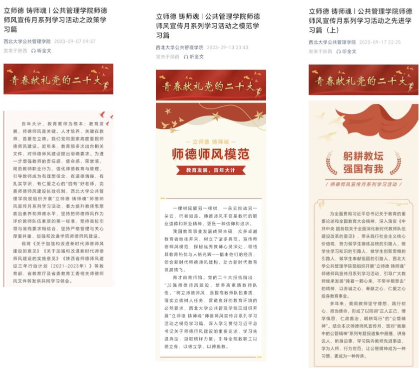 学院开展“立师德 铸师魂”师德师风宣传月系列学习活动,着力提升教师思想政治素养和师德水平,坚持把师德师风作为评价教师队伍素质的第一标准,坚持高位引领与底线要求相结合,坚持严格管理与关心厚爱并重,加强和改进学院师德师风建设。组织开展政策学习,全体教师认真学习《关于加强和改进新时代师德师风建设的意见》《关于加强和改进新时代师德师风建设的实施意见》《陕西省师德师风建设三年行动计划(2021-2023年)》等教育部、省教育厅及省委教育工委相关师德师风文件,集中学习《习近平致全国优秀教师代表的信》《习近平给东北大学全体师生的回信》,集体观看专题片《习近平的教师情》,学习教育家和优秀教师心有大我、至诚报国的理想信念,感悟和弘扬教育家精神,引导教师成为有理想信念、有道德情操、有扎实学识、有仁爱之心的“四有”好老师。组织学习于漪、卫兴华、张桂梅等全国教师模范典型的先进事迹,同时对“我眼中的公管精神”系列院内教师先进事迹专题报道集中展播,引导全院教职工以德立身、以德立学、以德施教。开展教师心理育人技能培训专题讲座,在拓展全体教师心理健康教育知识和技能的同时,提升教师队伍心理育人水平,使其做好学生的引路人和守护人。
