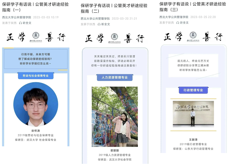 学院开辟“保研学子有话说——公管英才研途经验指南”专栏,发布3篇推送,对全院7个专业的所有保研学子进行了专题报道,充分展示了我院优秀学子的风采,引导在校学生提前做好学业规划和相应准备,助力其放平心态、确立目标、砥砺奋斗。