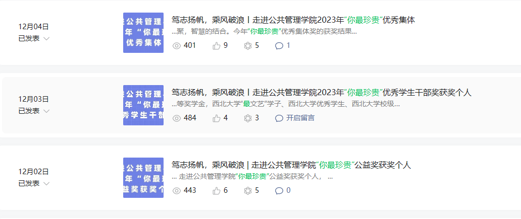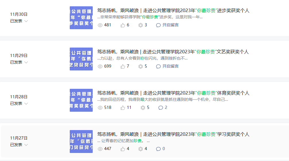 学院隆重举行“你最珍贵”优秀学生表彰大会,对2022年和2023年在不同领域争先创优、勇创佳绩、为院争光的优秀个人和先进集体进行表彰,共颁发学习奖、体育奖、文艺奖、进步奖、公益奖、优秀学生干部奖、优秀集体奖等七项荣誉奖励。激励公管学子于回首过去中撷取经验,于展望未来中务实进取,不断向榜样模范看齐。同时,开辟“获奖个人与集体”专栏,共发布7篇推送,对获得表彰的22名学生及5个学生组织和社团进行报道,邀请他们分享个人经验,激励同学们从榜样身上汲取力量,做到心中有模范、学习有榜样、行动有方向。