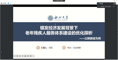 随后,9名同学依次进行发言。在第二单元养老服务专题的学术分享中,刘阳以《银发经济发展背景下老年残疾人服务体系建设的优化探析》为题探讨银发经济与老年残疾人服务体系的交互作用;于晓晴以《社区嵌入式养老服务的优势、困境与出路》为题阐述了自己对社区嵌入式养老的见解;徐妍以《探索建立养老志愿服务激励与评价机制,开展农村互助式养老》为题介绍了如何建立农村养老志愿服务激励与评价机制。在第三单元智慧养老专题的学术分享中,张苗以《加强养老相关数据共享,推动数据要素赋能养老产业发展》为题围绕数据要素赋能养老产业发展的现状、问题与对策进行了探讨;潘瑞玲以《数字时代、智慧适老与增进老年人福祉》为题,通过案例研究对我国推动智慧适老发展提出自己的思考;王苗苗以《数字治理助力养老服务的困境与策略》为题对数字治理助力养老服务的实践逻辑、现实困境和策略展开发言。在第四单元智慧养老专题的学术分享中,苏俊彬以《个人养老金税优政策的国际比较》为题,分析了美德澳三国个人养老金税优政策的主要实践、基本特征及对我国的启示;田雨浠以《数字技术使用与老年人再就业收入研究》为题,从定量研究的角度探讨互联网使用与老年人就业收入之间的关系;郭雨晨以《从掣肘到良性互动:人口老龄化与乡村振兴关系的再认识》为题,结合所学思考人口老龄化与乡村振兴之间的关系。
