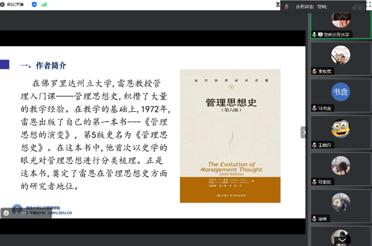 2022级社会保障研究生邓紫皎分享书籍是《管理思想史》,她首先简要介绍了管理的定义:管理始终被视为一门学科以及被视为一种对所有组织的努力至关重要的活动。紧接着,她提到,从内部来看管理思想经历了几个阶段:强调生产的技术方面;强调工作场所中的行为以及对人类固有需求的满足;强调领导对目标明确的组织的引导作用;强调组织的这种本质,即作为获得更大利益的工具;强调管理问题的组织和方法层。从外部看管理思想一直被不断发展的技术,不断变化的经济、社会和政治的价值观以及环境挑战和国际挑战影响。