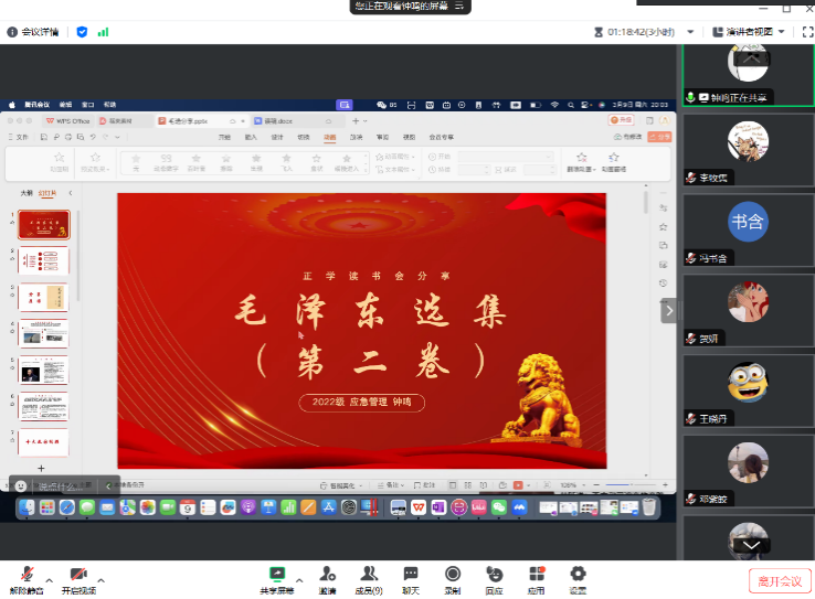 2022级应急管理专业硕士研究生钟鸣与大家分享了《毛泽东选集(第二卷)》,她从分享原因、十大救国纲领、论持久战和分享思考四个方面展开汇报。在简单阐述分享原因后,钟鸣针对《毛泽东选集(第二卷)》中两个重要内容:十大救国纲领和论持久战进行了分析,系统探讨了毛泽东同志在《论持久战》中所展示出的统揽战争全局的宏观视野、把控战争全程的超前思维以及洞悉战争本质的深刻理解。最后,她分享了自己的收获思考,即如何客观理智认清形势,准确自我定位并制定长期计划,培养目标定力。