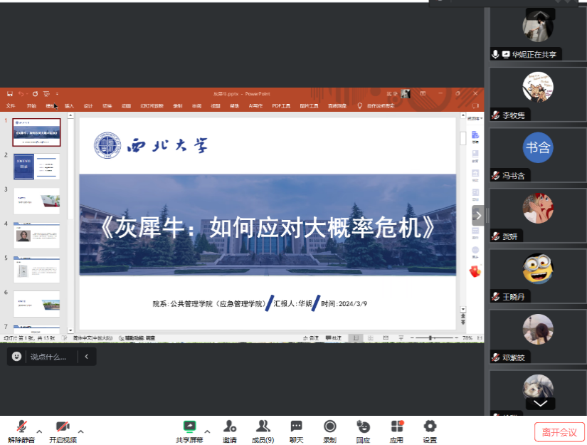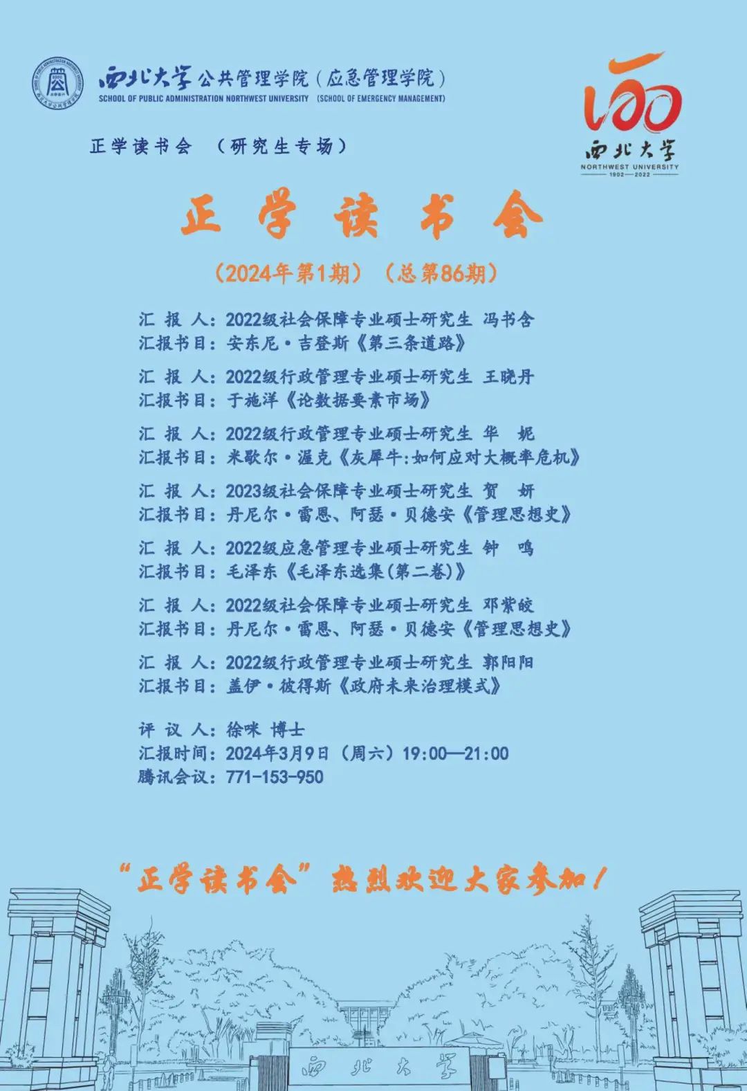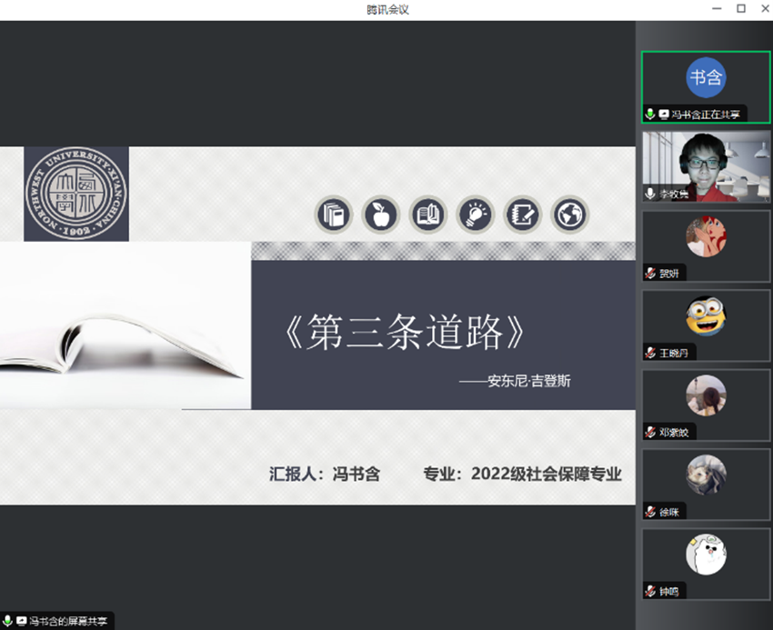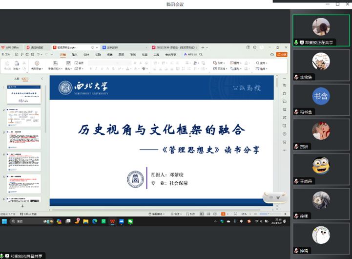 2024年3月9日下午,我院线上举办了2024年第1期正学读书会。西北大学565net必赢2022级社会保障专业硕士研究生冯书含、2022级行政管理专业硕士研究生王晓丹、2022级行政管理专业硕士研究生华妮、2023级社会保障专业硕士研究生贺妍、2022级应急管理专业硕士研究生钟鸣、2022级社会保障专业硕士研究生邓紫皎、2022级行政管理专业硕士研究生郭阳阳分别作为主讲人进行读书汇报,2023级公共管理专业徐咪博士担任评议人,部分研究生旁听了此次报告会。