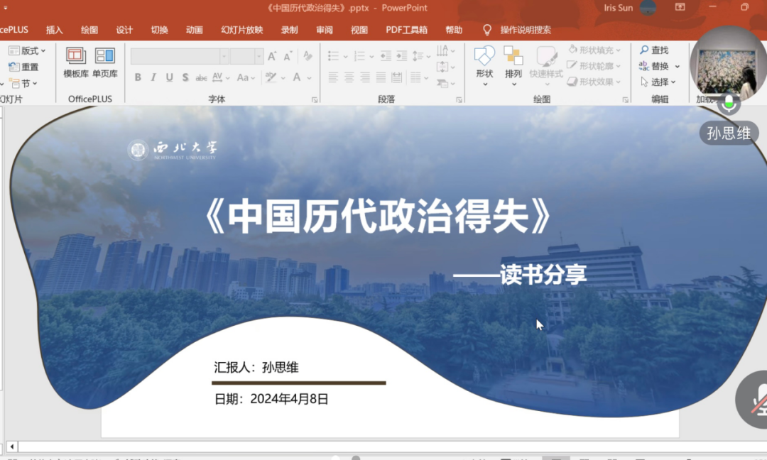 2023级行政管理专业硕士研究生孙思维分享的书籍是钱穆的《中国历代政治得失》。她的汇报内容包括作者简介、主要内容、思考与感悟三方面。首先,她简要介绍了本书的作者及写作背景。紧接着,她分别从政府的组织、考试和选举、赋税制度、国防与兵役制度四个方面,详细介绍了汉、唐、宋、明、清这五个朝代的政治制度及得失。最后,她分享了读完这本书的思考与感悟,表示制度是有现实性的,我们应该理性地看待一项制度并随着实践发展对其不断进行完善。