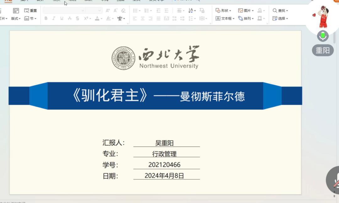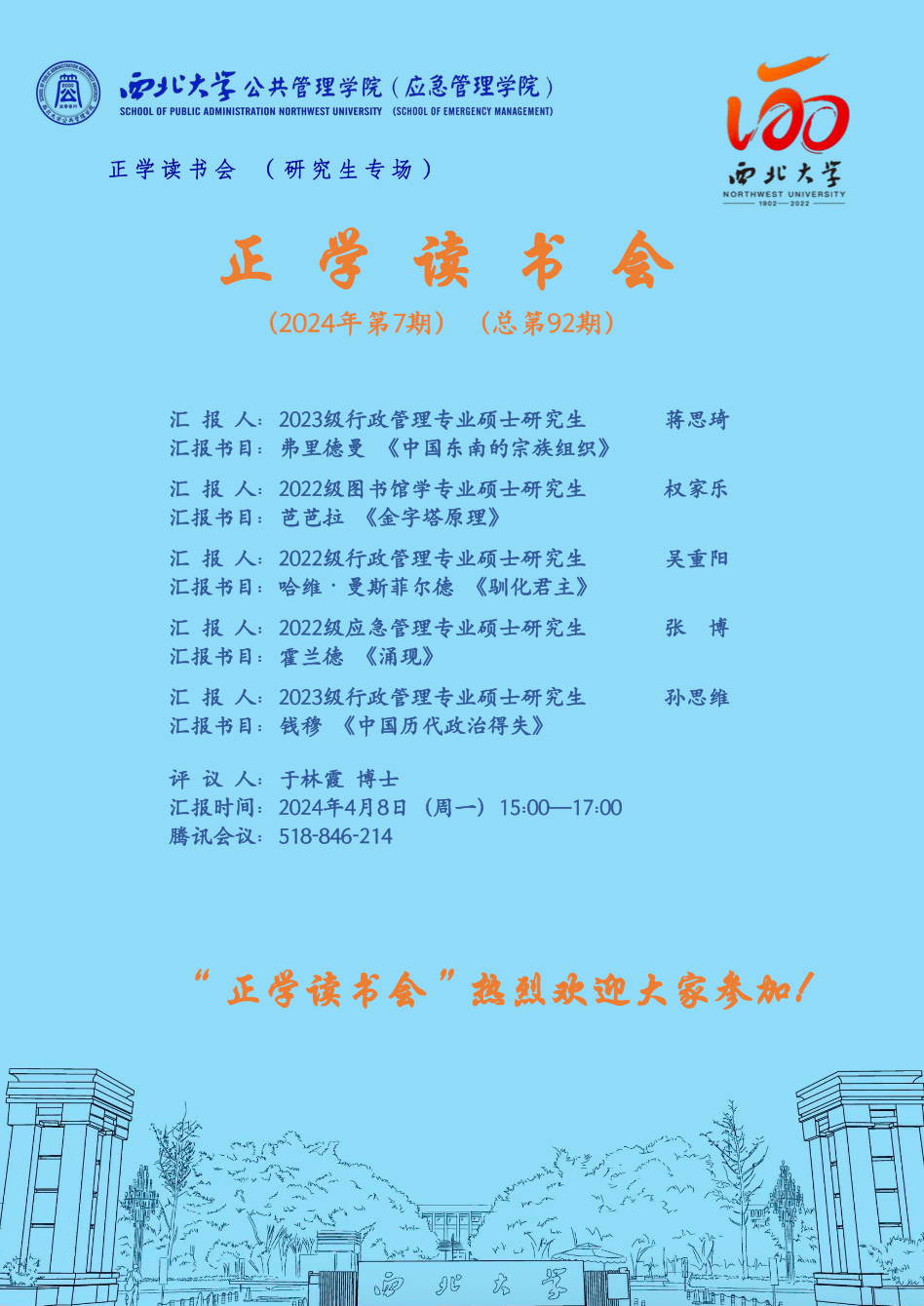 2024年4月8日,我院于线上举办了2024年第7期正学读书会。西北大学565net必赢2023级行政管理专业硕士研究生蒋思琦、孙思维,2022级图书馆学专业硕士研究生权家乐、2022级行政管理专业硕士研究生吴重阳、2022级应急管理专业硕士研究生张博分别作为主讲人进行读书汇报,565net必赢2023级博士研究生于林霞担任评议人,部分研究生旁听了此次报告会。