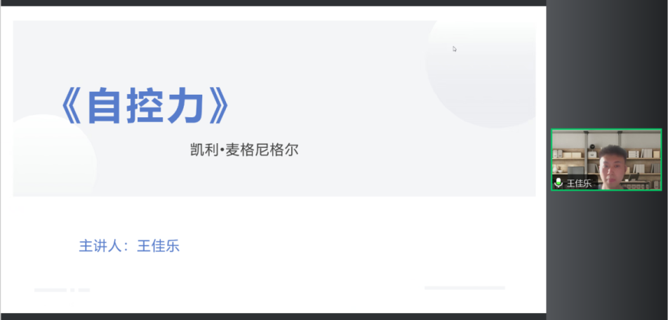 2021级应用心理学专业硕士研究生王佳乐分享了由凯利·麦格尼格尔撰写的书籍《自控力》。王佳乐同学首先对本书作了简要介绍,并综述了本书的大致内容。接着,他基于三个问题对书籍展开讲解。首先讲解了“意志力是什么”的问题,并引申出“为什么我们会把渴望当作幸福”的问题,接着运用实际案例对相关问题进行讲解,同时给出训练意志力的方法。最后,介绍了“我不要”力量的局限性,详细讲解了“白熊效应”,提出要对内接受自己的想法,对外控制自己的行动,同时也结合实际生活给出了我们如何摆脱不想要的想法的方法。