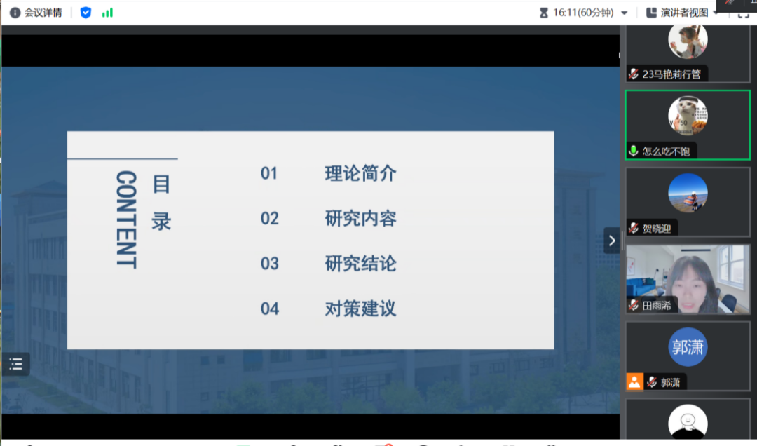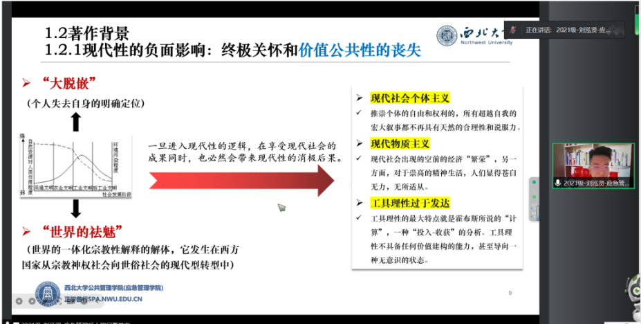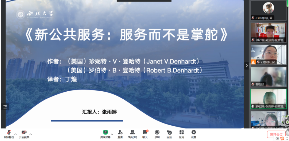 2024年4月13日上午,我院于线上举办了2024年第8期正学读书会。西北大学565net必赢2021级应急管理专业硕士研究生刘泓贤、2022级行政管理专业硕士研究生张雨婷、徐嘉乐,2021级应用心理学专业硕士研究生王佳乐、2022级社会保障专业硕士研究生田雨浠、2023级行政管理专业硕士研究生赵俊超分别作为主讲人进行读书汇报,565net必赢2023级博士研究生贺晓迎担任评议人,部分研究生旁听了此次报告会。