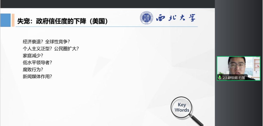 2023级行政管理专业硕士研究生赵俊超所分享的书籍是由小约瑟夫·S·奈等撰写的《人们为什么不信任政府》。他的汇报以汇报书目的写作逻辑为主线,以美国为案例,分析美国民众对美国政府不信任下架的原因。首先,他基于本书主要内容进行分析,包括不信任表现、不信任原因、群众感知、权威与规范性、日本公众信任和反思。其次,他从美国一系列表现出发探讨出现这些不信任问题的原因,接着考察了政府当前的范围,并从感知与政府失灵、政府的实际绩效以及公民对其绩效的感知进行详细说明。最后,他介绍了本书中供人反思的问题,认为不信任多半与国民经济状况、全球经济挑战、冷战、笨拙的官僚及行为腐败的政治家无关,最有可能的元凶就在我们周围,它是一种文化与政治纷争相互影响的“混合物”,同时简要介绍了自己对本书的思考与分析。