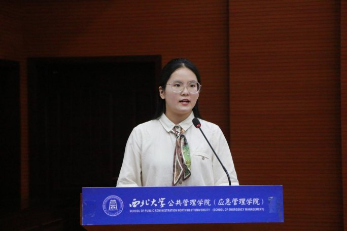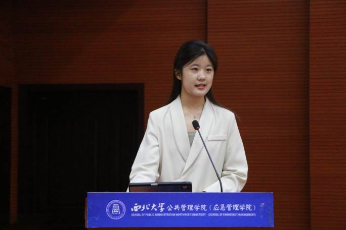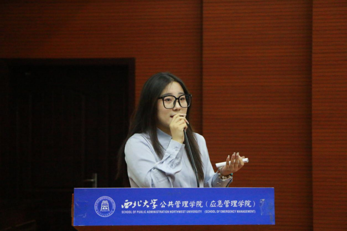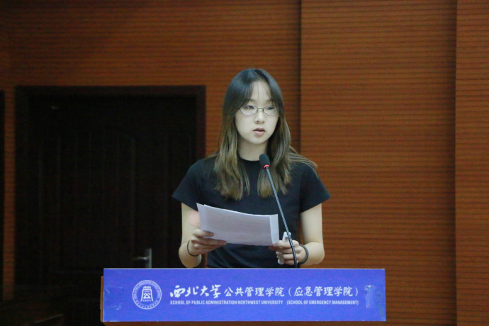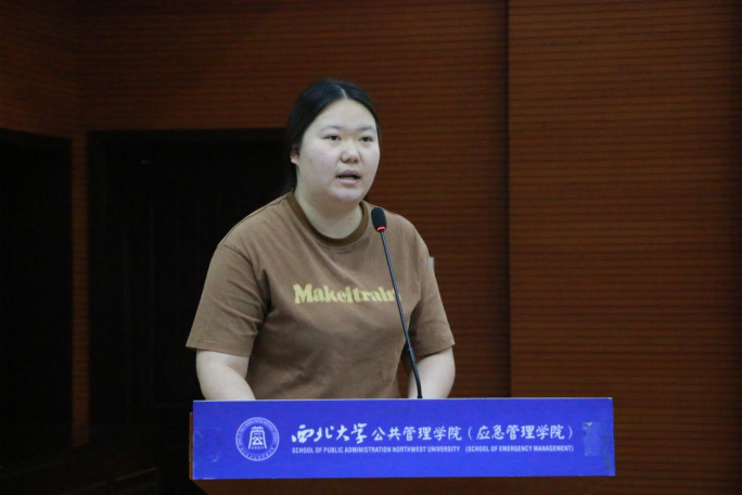李佳玥在汇报陕西省社会保障局实习部分中,对实习单位、各科室工作以及中期座谈会进行了概括,并分享了每位同学对于本次实习经历的心得感悟,同学们在实践中既对“为人民服务”的理解更加透彻,又对自身的不足与成长更加清晰。在汇报西北大学校内实习部分中,她以“应用专业就能,开启就业探索”为题,分部门分岗位详细介绍了本次校内实习的情况,强调此次实习经历能够更好地建立职业联系,激发就业热情。