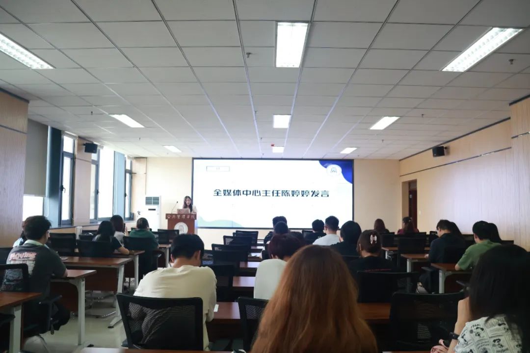 会议开始之际,全媒体中心主任陈婷婷发表讲话。陈婷婷指出,在过去的一年中,在管理团队的精心指导下,全媒体中心的各职能部门均实现显著进步并取得了稳定的成绩。随后,陈婷婷着重强调了全媒体各部门在塑造学院整体形象和文化建设方面所发挥的关键作用。最后,陈婷婷对团队成员的成长与协作精神表示赞赏,并期望大家未来能更加紧密合作,共同促进全媒体中心的发展。