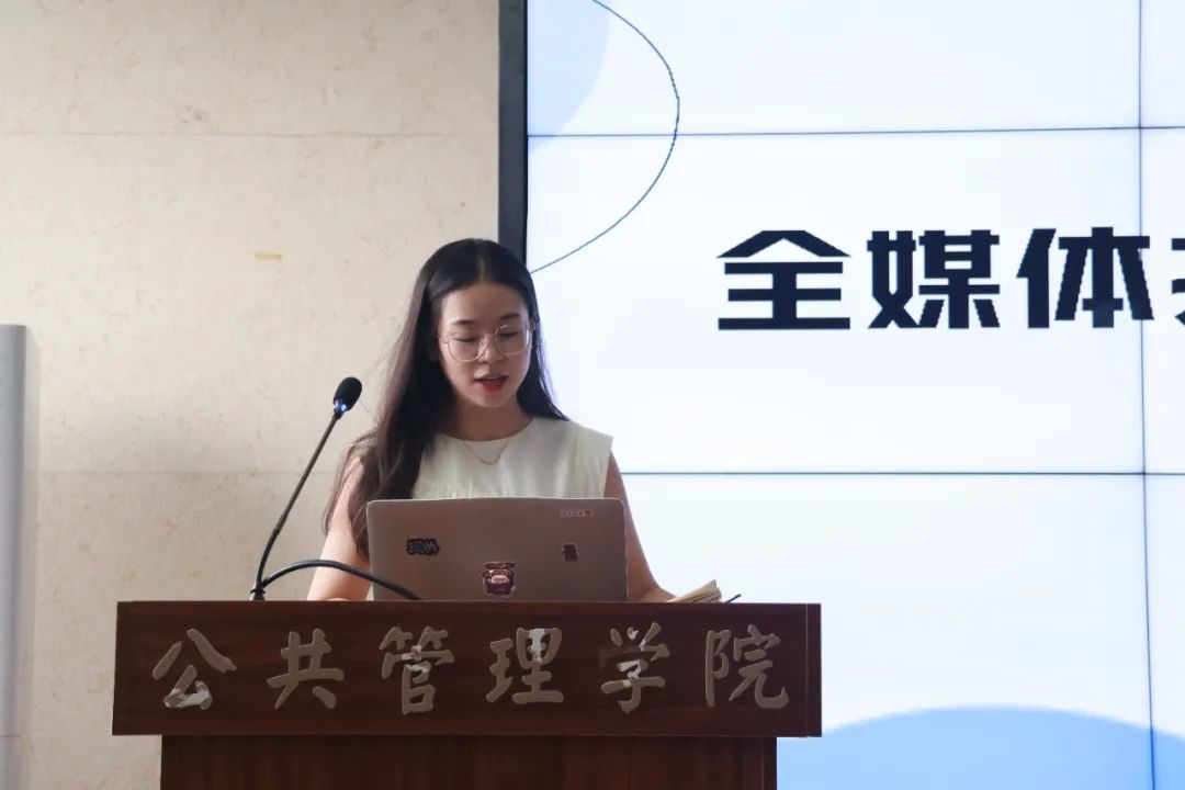 大会第三项,全媒体中心指导老师王晶玉发表讲话。首先,王晶玉老师就全媒体中心全体成员于过去一学年中对学院宣传工作的鼎力支持以及对全媒体中心的全身心投入致以谢意。随后,王晶玉老师肯定了本学年的工作成果和成员的成长进步,同时也指出了工作中存在的不足,并给出了建设性的建议。最后,王晶玉老师对新一届的成员寄予厚望,期待他们能够继承和发扬优良传统,创新工作方式,共同推动全媒体工作向更高的层次发展。