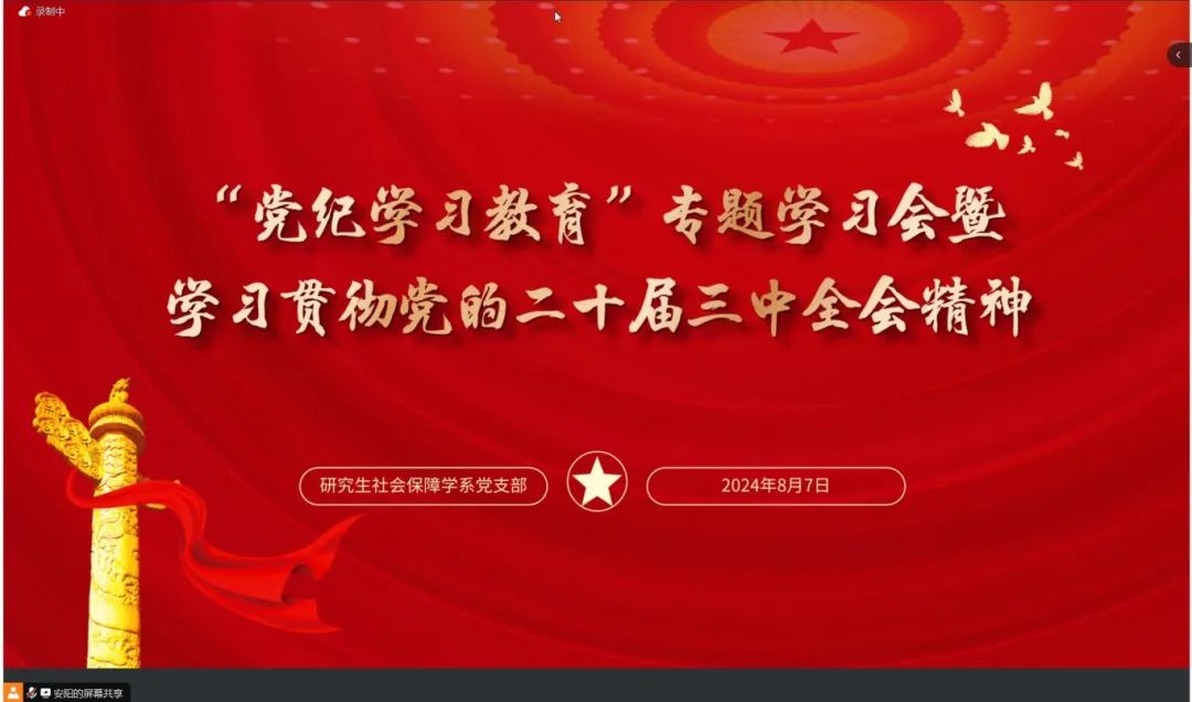 为深入学习贯彻党的二十届三中全会精神,持续纵深推进党纪学习教育,提升支部党员的党性修养,确保党员能够将会议精神融入日常学习和科研工作中,我院研究生社会保障学系党支部于8月7日18:00在线上开展“党纪学习教育”专题学习会暨学习贯彻党的二十届三中全会精神。会议由党支部书记安阳同志主持。