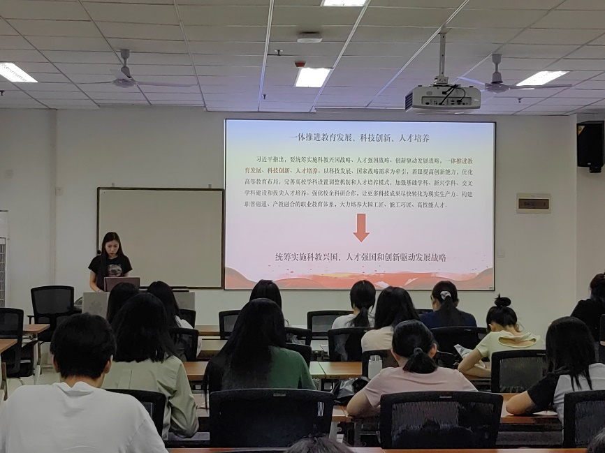 会议第三项议程为分党校学生负责人李文以《紧紧围绕立德树人根本任务,朝着建成教育强国战略目标扎实迈进》为学习主题,带领大家学习探讨习近平总书记在全国教育大会上的重要讲话精神。通过梳理历史脉络,李文同志带着大家回顾了历次全国教育大会的核心议题与关键成果,并聚焦2024年全国教育大会,详细介绍了大会的召开背景,指出在当前国内外形势复杂多变的背景下,大会的召开对于明确新时代教育发展方向、推动教育现代化具有深远意义。随后鼓励大家在新时代的教育工作中,要始终坚持正确的政治方向和育人导向,不断提高自身政治素养和业务能力,积极适应教育改革发展的新要求,为实现教育现代化、建设教育强国贡献自己的力量。