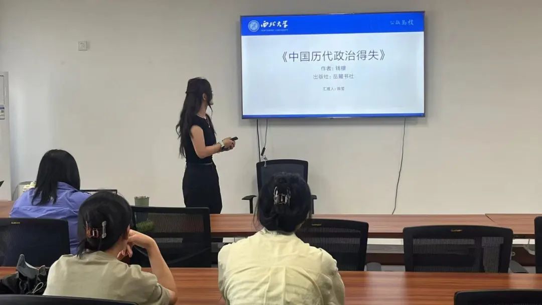 2024级行政管理专业硕士研究生陈莹分享的书籍是钱穆的《中国历代政治得失》,她主要从作者简介、主要内容和个人感悟三个方面进行汇报。首先,她简要介绍了钱穆先生的成就以及写作背景,认为他以现代人的视角,在传统与当代之间架起了一座沟通的桥梁。其次,在梳理了全书章节内容后,按照书中的朝代逻辑汉、唐、宋、明、清对政府组织、选举制度、经济制度、兵役制度四个方面进行了系统性的概括和总结,并且对于每个朝代在这四个部分的变化进行重点介绍,论述一项制度的由来、发展、最终腐化的过程,给人以深思。最后,她从应理性客观探寻历史、避免上帝视角、以及事情的发生有其因果三个方面分享了自己的感悟,历史作为一个客观事实应避免武断的去评判。