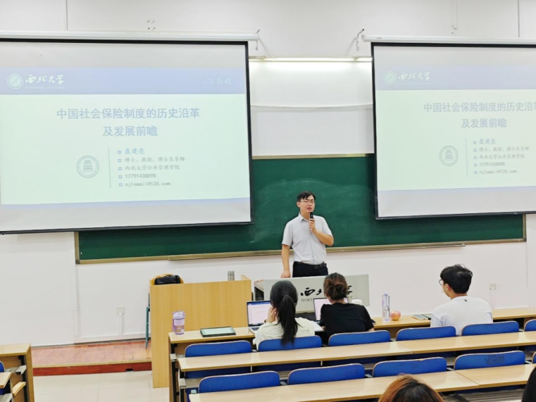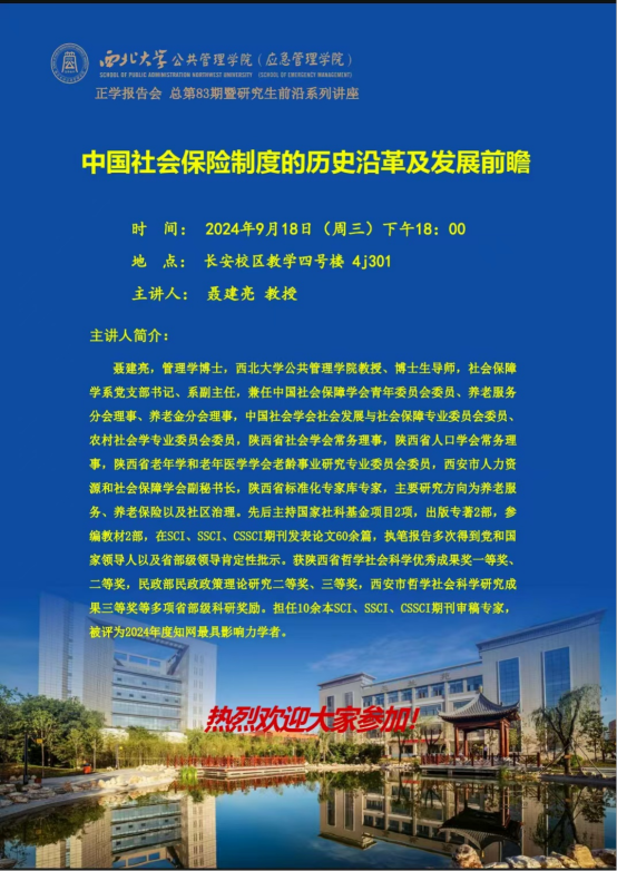2024年9月18日晚18:00,西北大学565net必赢聂建亮教授在长安校区教学四号楼4j301为我院2024级全体硕士研究生作了题为“中国社会保险制度的历史沿革及发展前瞻”的专题讲座。