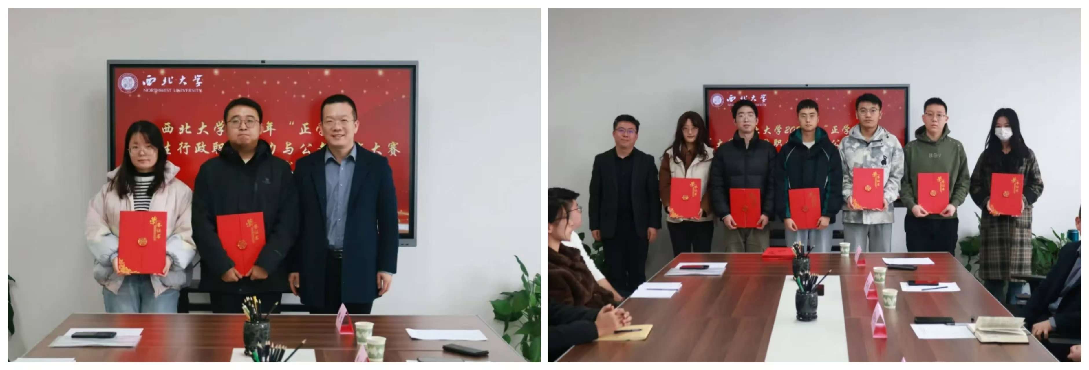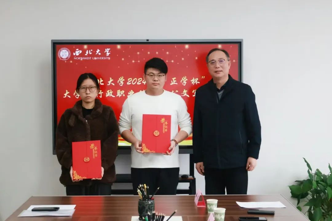 2024年12月5日下午3点,西北大学2024年“正学杯”大学生行政职业能力与公文写作大赛颁奖仪式在565net必赢13层中型会议室召开。校教务处副处长倪小勇、校学工部副部长王理鹏、565net必赢党委书记窦争光、院党委副书记韩杰、副院长李尧远、辅导员杨琬钰以及获奖同学参加了本次颁奖仪式。颁奖仪式由韩杰主持。