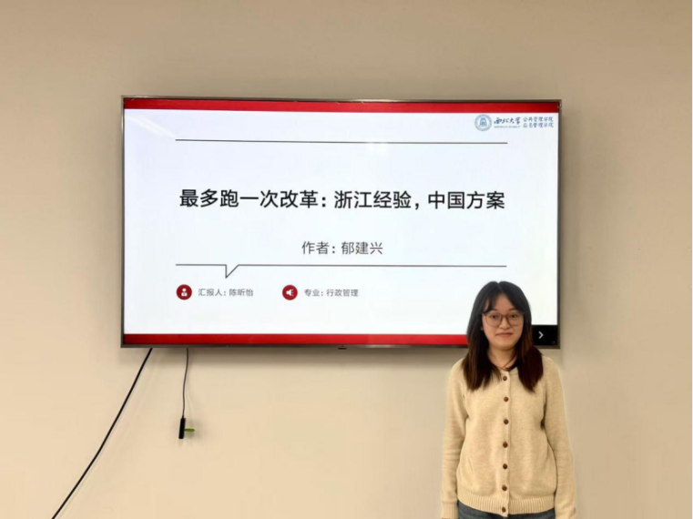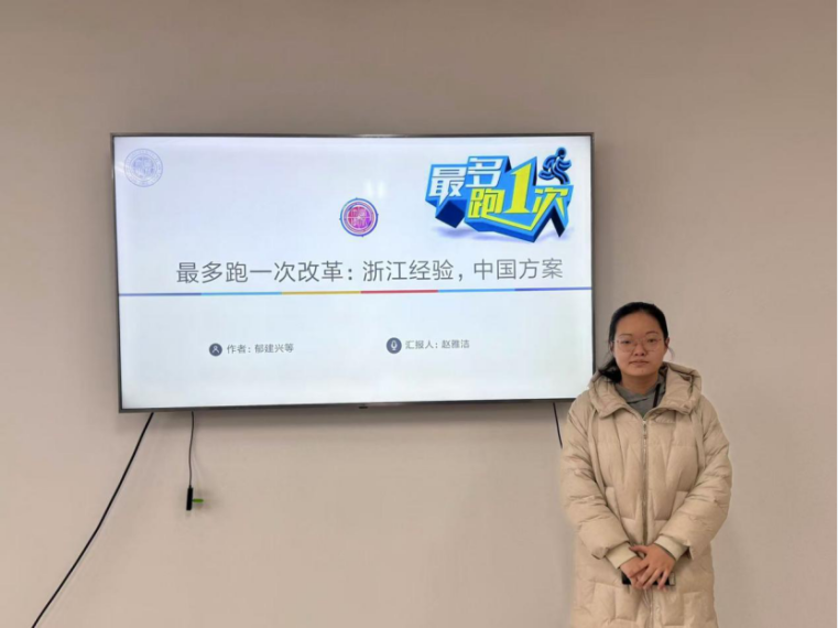 2024级行政管理专业硕士研究生赵雅洁分享的书籍是郁建兴等的《最多跑一次改革:浙江经验与中国方案》,她从背景、主要内容、总结与讨论三个部分展开。首先介绍了本书作者与书籍主要内容,而后依照各章顺序,依次介绍了浙江省“最多跑一次”改革的缘起、进展与成效、改革对经济、社会、权力等领域体制改革的撬动效应、改革的政策创新扩散效应、改革的管理保障等内容。最后进行了总结并介绍了学界该领域的研究重点。不同于传统的“以政府为中心”的改革逻辑,“最多跑一次”改革是一场将“以人民为中心”作为指导理念、以“互联网+政务服务”为技术支持、以“一窗受理”“一网通办”为主要手段的全面政府改革。通过这次改革,民众可以在充分掌握信息的前提下通过事先的充分准备,在一个办事大厅、一个办事窗口一次性将事宜办理完成。这场改革回应了科层制官僚主义特征使得其远离理性化制度初始目标的倾向,从规范性层面及价值理念角度将政府与人民的“主宾位置”进行了对调,这样的革新治理不仅是中国本土的叙事,也因其回应了科层制治理中面临的难题而拥有了全球性意义。
