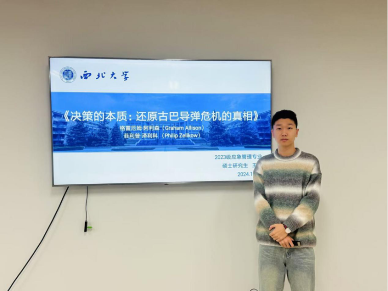 2023级应急管理专业研究生王萌分享了格雷厄姆·阿利森和菲利普·泽利科合著的《决策的本质:还原古巴导弹危机的真相》一书。他从书籍简介、历史背景、主要内容及结论与思考四个方面展开。首先,他简要介绍了《决策的本质》一书的写作背景及在学术界的影响力,该书通过详细剖析古巴导弹危机这一历史事件,揭示了决策过程中复杂多变的因素及其对国际关系格局的深远影响,是理解国际政治决策的重要读物。随后,他回顾了古巴导弹危机的历史背景。危机期间,美国发现苏联在古巴部署导弹,引发了全球范围内的紧张局势和军事对峙。接着在主要内容部分,他通过作者提出的三种决策模式详细阐述了美国与苏联对古巴导弹危机决策过程。最后,在结论与思考环节,他结合应急管理专业的特点,对书中的观点进行了深入思考和总结。此书不仅为理解古巴导弹危机这一历史事件提供了新的视角,也揭示了政府决策背后的复杂逻辑和深层次原因。利于我们更加深入地理解国际关系和国家政策选择,增强对于政府决策过程的认识和理解。