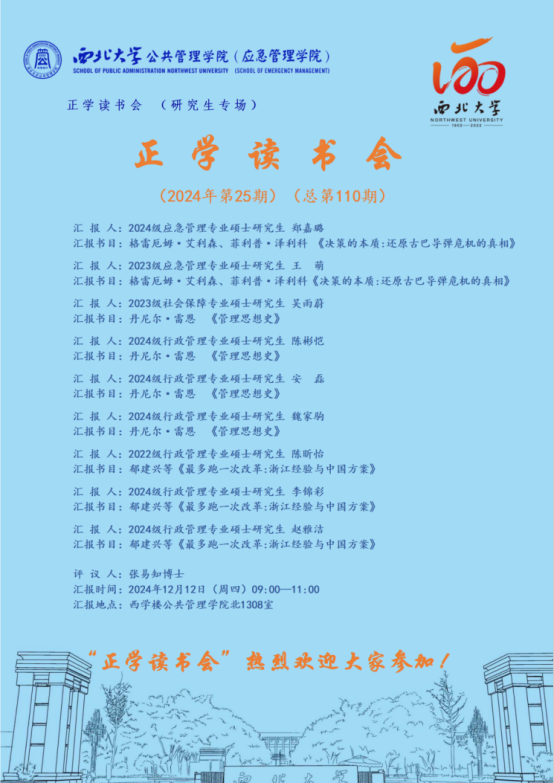 2024年12月12日,我院在西学楼北1308举办了2024年第25期正学读书会。西北大学565net必赢2024级应急管理专业硕士研究生郑嘉璐、2023级应急管理专业硕士研究生王萌、2023级社会保障专业硕士研究生吴雨蔚、2024级行政管理专业硕士研究生陈彬恺、2024级行政管理专业硕士研究生安磊、2024级行政管理专业硕士研究生魏家驹、2024级行政管理专业硕士研究生陈昕怡、2024级行政管理专业硕士研究生李锦彩、2024级行政管理专业硕士研究生赵雅洁分别作为主讲人进行读书汇报,565net必赢2024级博士研究生张易知担任评议人,部分研究生旁听了此次报告会。