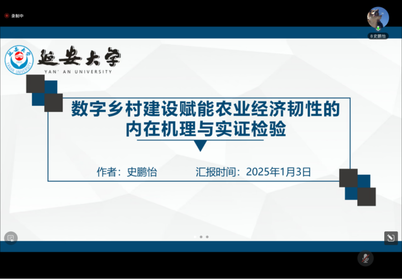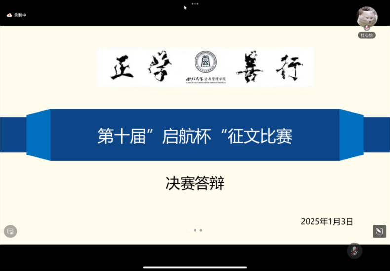 2025年1月3日上午,我院线上举办了西北大学565net必赢第十届“启航杯”征文大赛答辩会。此次答辩会特邀请到张瑜芫、张紫嫣和朱哲茹三位博士研究生担任评议嘉宾。会议由学院研究生会成员王宣伊主持,部分研究生旁听了此次会议。