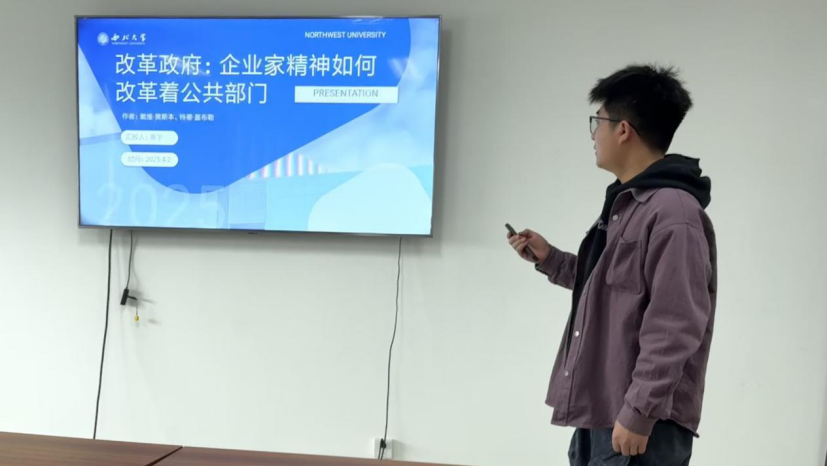 2023级行政管理专业硕士研究生鲁宇分享的书目是戴维·奥斯本、特德·盖布勒的著作《改革政府:企业家精神如何改革着公共部门》。他从作者与写作背景、核心观点与理论框架、企业家政府十大原则、支持与批判、对当代中国公共管理的启示五个方面并结合自己的思考展开分享。首先他简要介绍了20世纪90年代面临公共治理困境的时代背景,进而引出该书主张政府引入竞争、创新与效率理念,以提升公共服务质量与资源利用效率的观点。其次,他结合国内外政府治理的十个典型案例,分享了书中企业家政府十大原则的十个章节,分别从各个原则的核心内容、现实案例、面临挑战和应对策略几方面进行总结,言简意赅。随后,他又领学了学界对该书的支持观点与批判声音、对当代中国公共管理的启示两个部分内容。