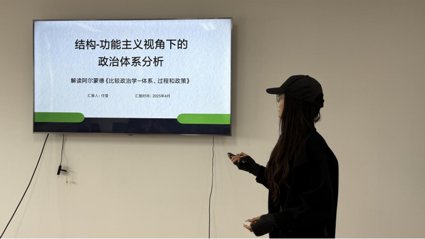 2023级行政管理专业硕士研究生任莹分享了政治学家加布里埃尔·阿尔蒙德的经典著作《比较政治学—体系、过程和政策》。她首先梳理了著作的核心理论,即阿尔蒙德将政治体系视为由选民、利益集团、立法与官僚机构等结构互动形成的公权力系统,其发展依赖于结构与功能的动态适应。其次她重点解析了政治体系的三层次功能——体系功能(政治社会化、录用与交流)维护系统稳定,过程功能(利益表达、综合与决策)实现输入到输出的转换,政策功能则通过输出与反馈体现治理效能。然后结合案例,阐述了政治文化与结构分化的关联。最后她指出该理论的局限性,如对文化历史特质的简化处理,以及西方中心主义倾向。